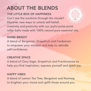 Can’t see the sunshine through the clouds? Discover new ways to unlock self-belief, creativity and positivity with our joyful pulse point roller balls made with 100% natural pure essential oils