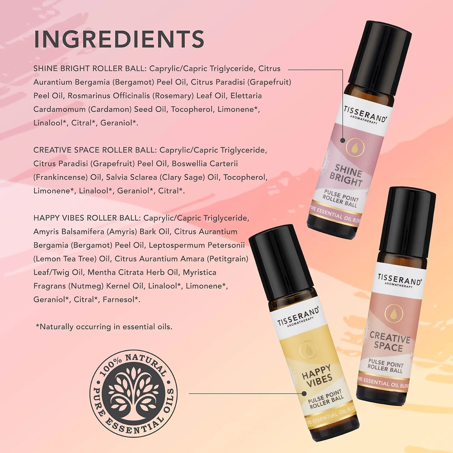 Creative Space Roller Ball: Caprylic/Capric Triglyceride, Citrus Paradisi (Grapefruit) Peel Oil, Boswellia Carterii (Frankincense) Oil, Salvia Sclarea (Clary Sage) Oil, Tocopherol, Limonene*, Linalool*, Geraniol*, Citral*. *Naturally occurring within essential oils.